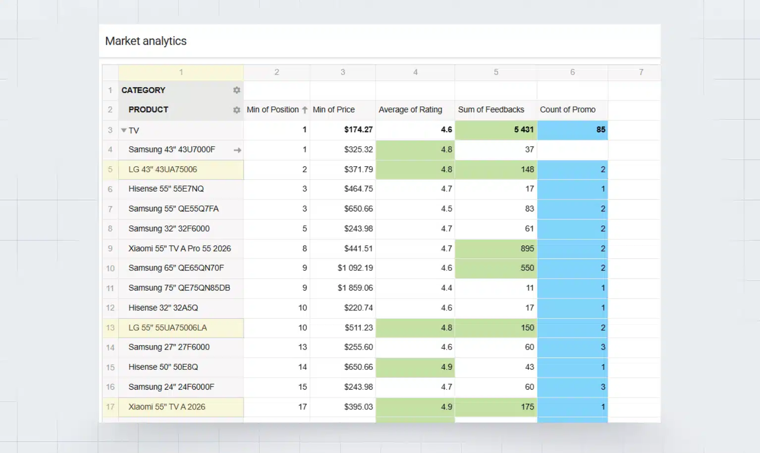 LG 43″ 43UA75006 (minimalna pozycja: 2) — średnia ocena 4,8, 148 opinii, u 2 konkurentów w promocji. Sygnał, że produkt jest aktywnie promowany przez konkurencję.