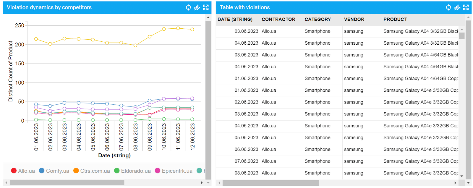 W lewym widżecie możesz zobaczyć dynamikę naruszeń MSRP w ujęciu dziennym w określonym okresie. Pozwala to analizować wzorce i dynamikę – na przykład możesz zauważyć, że szczyt naruszeń MSRP przypada na weekendy.