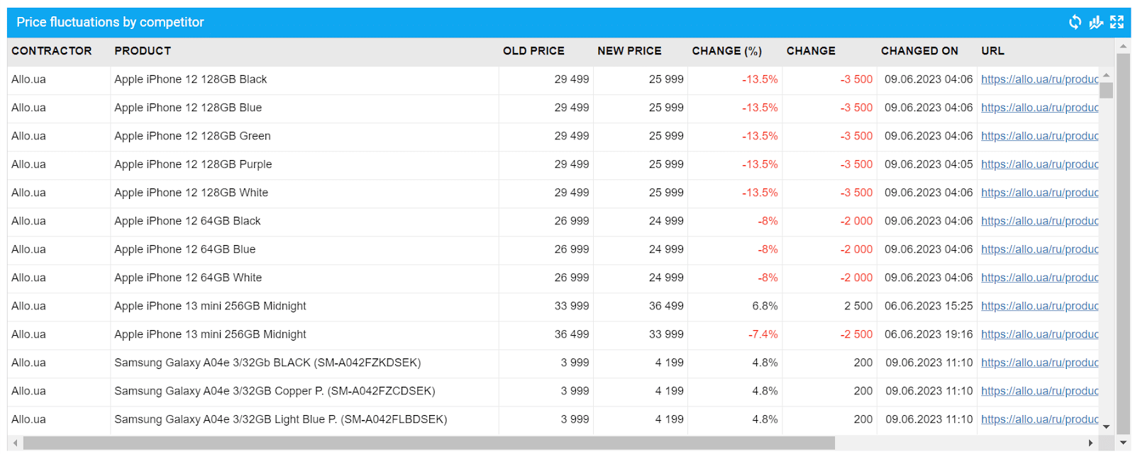 Parser Pricer24 odwiedza strony internetowe Twoich konkurentów kilka razy dziennie i rejestruje zmiany cen. Informacje te są zawarte w raporcie Wahania Cen, a jego widżet możesz również przypiąć do swojego panelu.