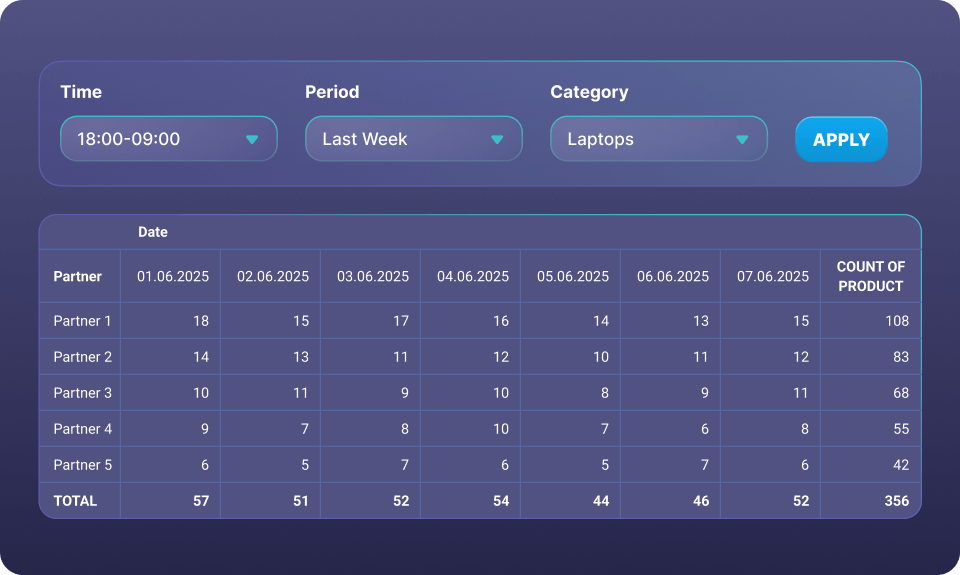 Зазвичай ми оновлюємо дані 5–7 разів на день — нашим клієнтам цього достатньо. Але, якщо потрібно частіше, можемо хоч щогодини.