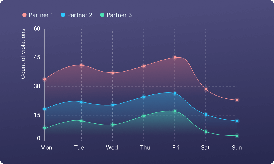 Відстежуйте порушення в позаробочий час і 24/7 на детальному графіку. Вивчіть стратегію партнерів та дійте кмітливіше.