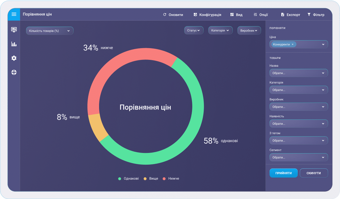 Платформа аналізує ваше цінове положення на ринку: скільки конкурентів мають кращі і гірші ціни, на скільки ціни відрізняються, у кого ціни нижчі та вищі за ваші.