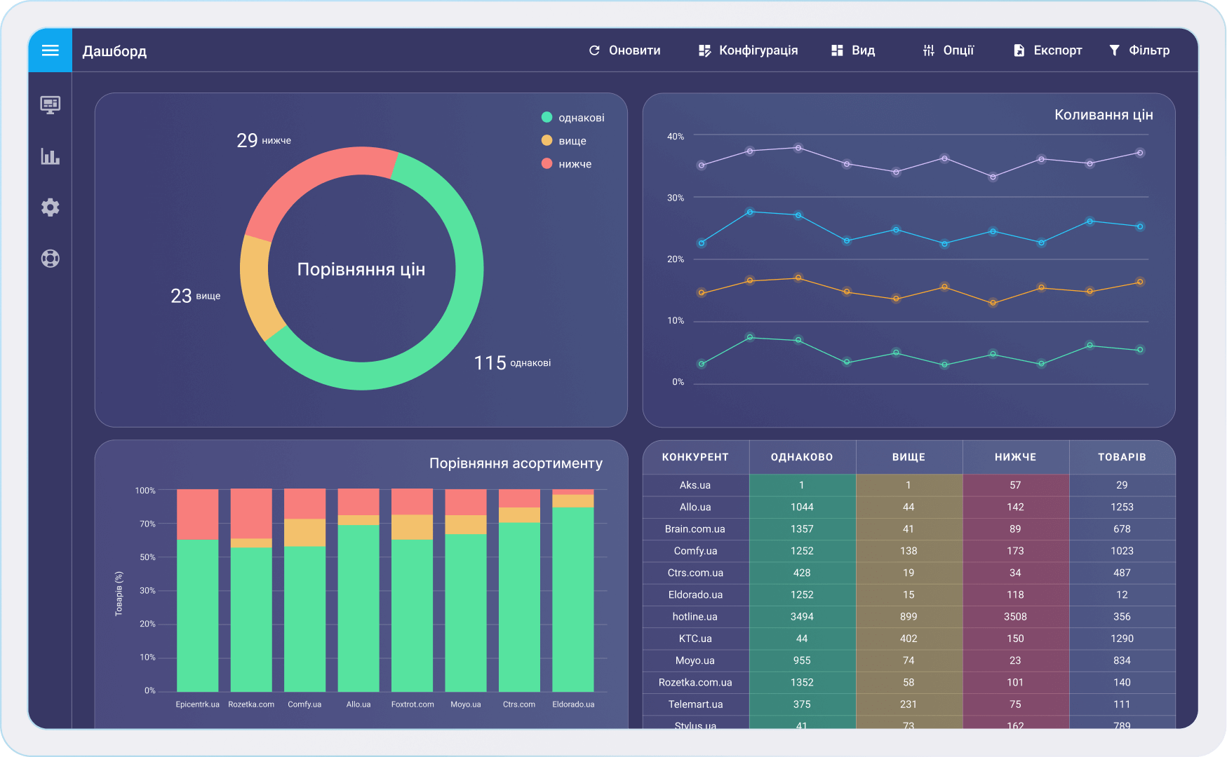 • Дані про ціни конкурентів оновлюються регулярно: автоматизовано щоденний моніторинг пропозицій конкурентів на Hotline.